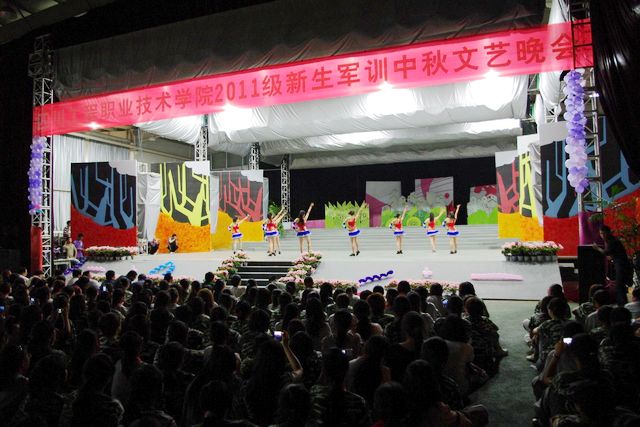 9月12日中秋夜,学院院长司徒渝,正院级调研员吴烈,副院长贺文佳、赵小培、李登万、杨跃等六位学院领导同3200余名军训新生一起在体育馆观看演出,共同度过了一个愉快而特别的中秋佳节。