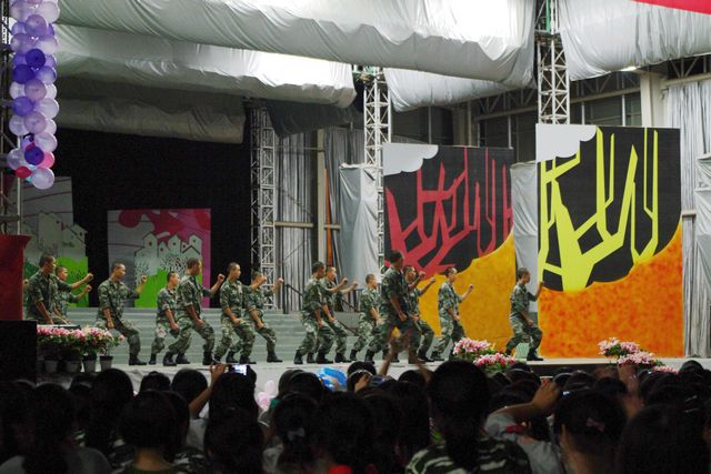司徒渝院长首先代表学院党委、行政致中秋祝辞,向辛勤工作在军训岗位上的承训部队官兵和老师以及3200余名刻苦训练的新同学致以节日的问候和衷心的祝福,寄语全体新生以学校为家,以师长同学为亲人,刻苦训练,勤奋学习,努力成才,报效祖国。随后,文艺晚会表演了新生利用训练间隙排练的歌舞、小品和武术表演,学院选送的健美操、拉丁舞、排舞等节目也登台展示,表达出了学哥学姐对新同学的美好祝福。