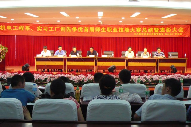 由机电工程系教工第一党支部,学生第一党支部和实习工厂党支部联合主办的首届师生职业技能大赛经过近三个月的激烈比拼,于近日圆满结束。6月30日,首届师生职业技能大赛表彰大会在新图书馆三楼报告厅举行。学院副院长李登万、徐诗勤,实习工厂厂长曾祥录、党总支书记陈振宇,机电工程系主任武友德、党总支书记李莉勤,实习工厂厂长助理周奎与机电工程系全体教工党员、学生党员和实习工厂党支部党员代表出席了大会。大会由工厂党支部书记陈振宇主持。