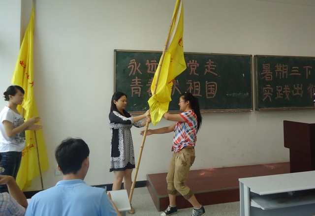 出征仪式上,学院学工部部长助理邱黎明做了暑期社会实践动员讲话,学院团委文佳老师为7支社会实践团队授旗。出征仪式结束后,学院材料工程系的大学生暑期“三下乡”社会实践服务团队一行10人出征,标志着我校暑期“三下乡”社会实践活动正式拉开帷幕。