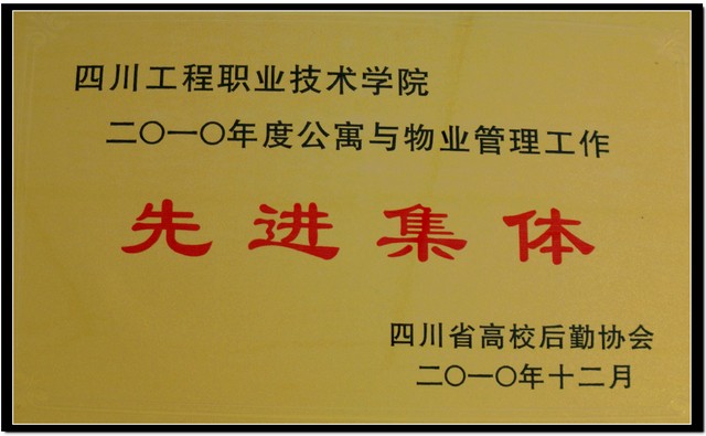 简讯:近期,在成都召开的四川省高校后勤协会公寓与物业管理专业委员会2011年年会上,我院被评为“二〇一〇年度公寓与物业管理工作先进集体”,这是自2006年以来我院第四次荣获该称号。同时,学院学生宿舍安全员王晓容、张德富被评为2010年度“公寓管理先进个人”。
