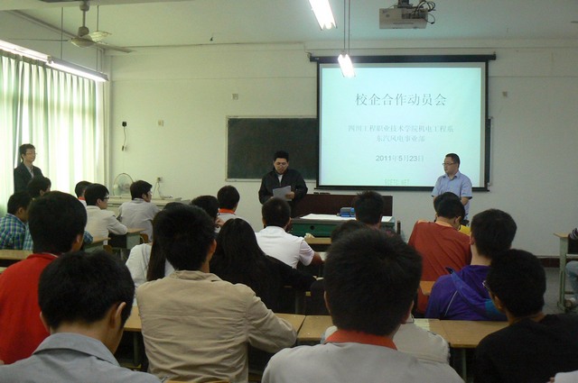 5月23日,机电工程系与东方汽轮机有限公司风电事业部在第二教学楼207教室召开了“校企合作动员会”。机电系主任武友德主持会议,东汽风电事业部副部长刘平,机电系副主任朱超、系党总支副书记李泳明出席会议。会上,刘平副部长代表东汽对49名即将前往东汽风电事业部开展技术服务工作的同学表示欢迎,并详细介绍了工作内容、发展前景、晋升机制。他勉励同学们继续加强学习、努力实践,争做优秀人才,争取毕业后能留在东汽工作,为国家的高端装备制造业的发展做出自己的贡献。武友德主任对同学们在东汽提供技术服务期间的工作纪律、人身安全等提出了具体要求。