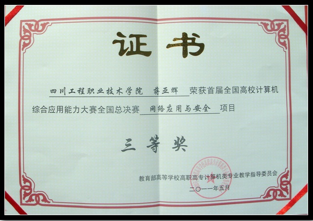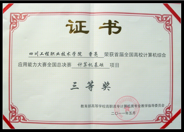在今年五月全国首届高职高专院校计算机综合应用能力大赛中,我院计算机科学系的3名参赛学生夺得了两个三等奖。