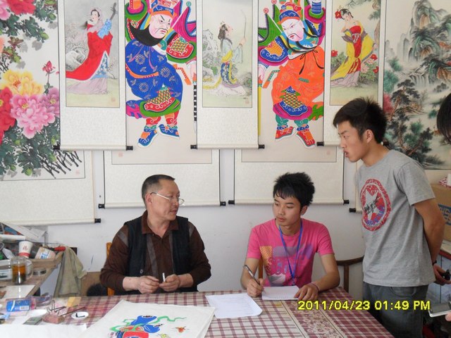 正当同学们在年画村82岁老艺人陈兴才家中进行调研时,学院院长司徒渝也陪同省市有关领导来到年画村参观。当司徒院长看到同学们时,非常高兴,同学们看到自己的院长,都兴奋不已。司徒渝院长亲切地与同学们交谈,并对同学们的乡村旅游调研进行了现场指导。院长鼓励同学们要好好学习,全面提高素质,为今后建设祖国的旅游事业打下坚实的基础。