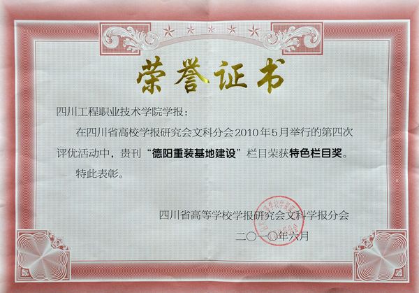 日前,我院《学报》再传捷报,在连续两届被评为全国高职高专优秀学报之后,其开设的“德阳重装基地建设”栏目又在2010年四川省高等学校文科学报研究会第四届高校社科期刊评优活动中被评为“特色栏目”。