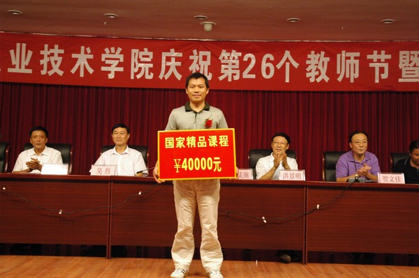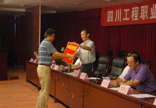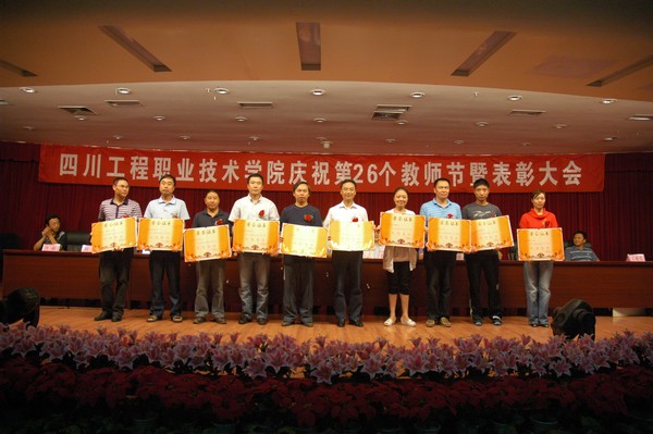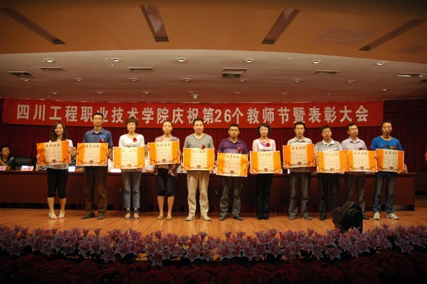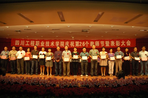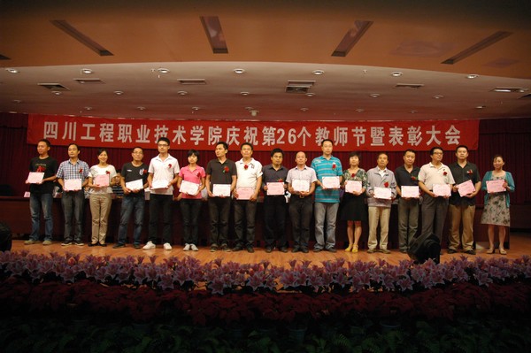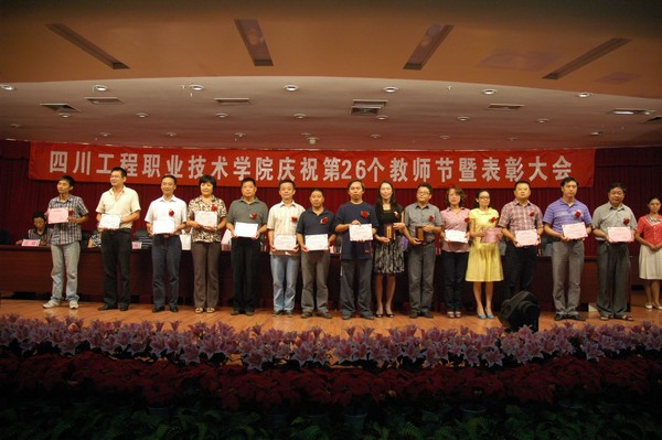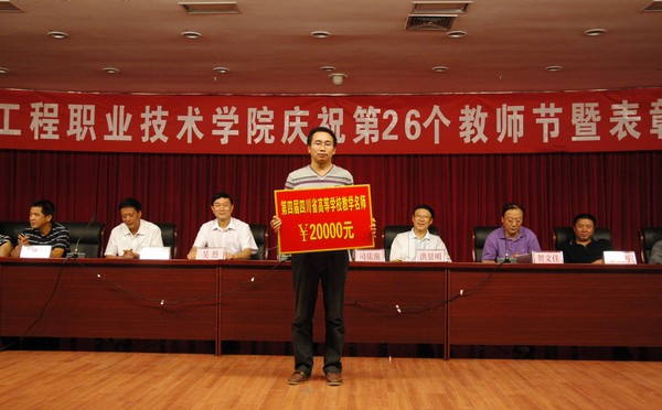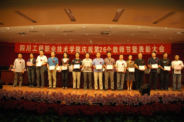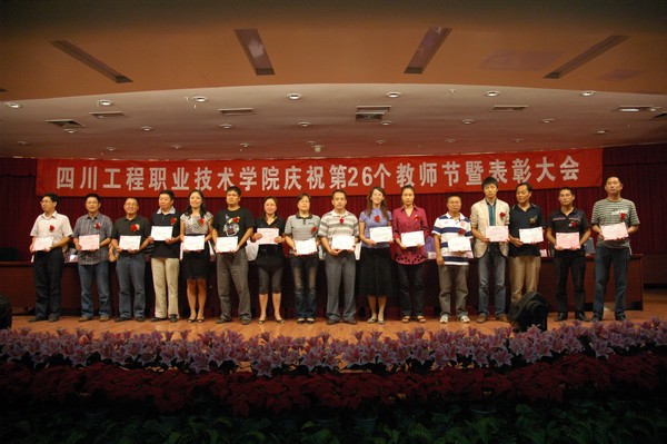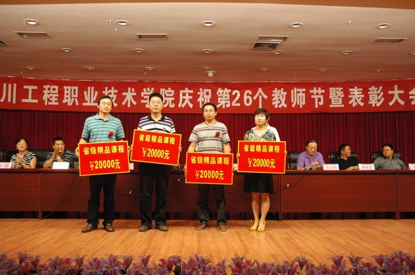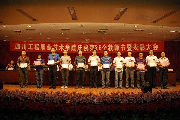 我院《工业网络控制系统安装与调试》、《铸造工艺CAE技术》、《CAD、CAM技术》、《设计素描》四门课程被评为“2010年四川省精品课程” 。图为课程建设团队代表上台接受表彰。 丁建生同志代表“四川省高等学校2010年省级教学团队”——材料成型与控制技术专业教学团队接受表彰