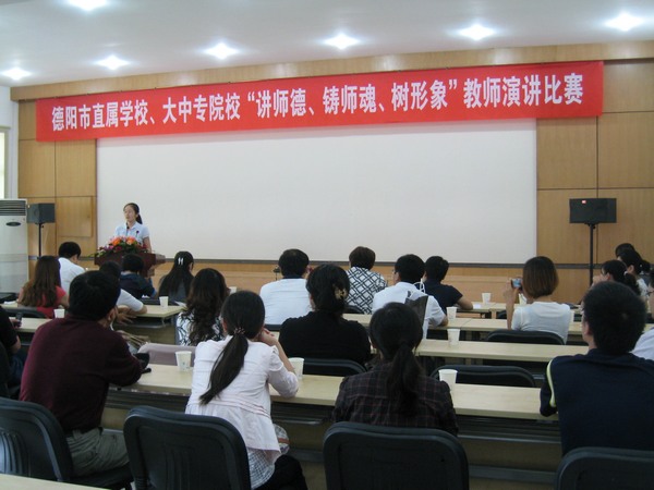 德阳市直属学校、属地大中专院校教师“讲师德、铸师魂、树形象”演讲比赛于2010年9月9日14:00在德阳市教育局礼堂举行,经全市十五个学校初赛选拔出的15位选手,经过精心准备,纷纷登台演讲。我院教师李晖,演讲内容真实感人,声情并茂,夺得演讲比赛一等奖。