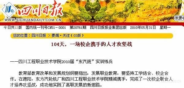 5月31日,四川日报刊登了一篇名为《104天,一场校企携手的人才攻坚战》的文章,文章记录了学院2010届“东汽班”实训练兵的全过程,从“人才告急,校企携手共迎挑战”到“奋战百天,精诚合作共克难关”,再到“共建共赢,人才合格三方受益”, 我院2010届焊接技术及自动化专业东汽针对性强化实训班背后的故事被一一展开,学院在推行校企深度合作、服务重装产业的办学历程中对人才培养的有益探索,成为了亮眼的主题。该文章刊登后,立刻引起了媒体的广泛关注,新华网、人民网、中国高职高专教育网、搜狐网、腾讯网、网易、四川新闻网等网络媒体也纷纷转载。