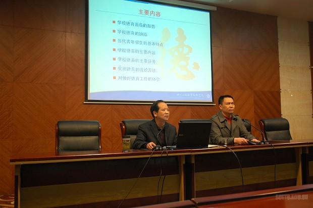 本次培训会由张斌副书记主讲。张斌副书记以“学校德育工作的问题与对策”为题,从学校德育面临的形势、学校德育的缺陷、当代青年学生的基本特点、学校德育的主要内容、学校德育的主要任务、实施德育的途径方法、对做好德育工作的体会等七个方面作了深入的分析和讲解,对进一步提高学生管理队伍素质,推进辅导员(班主任)队伍建设,强化学校德育工作,起到了积极的促进作用。