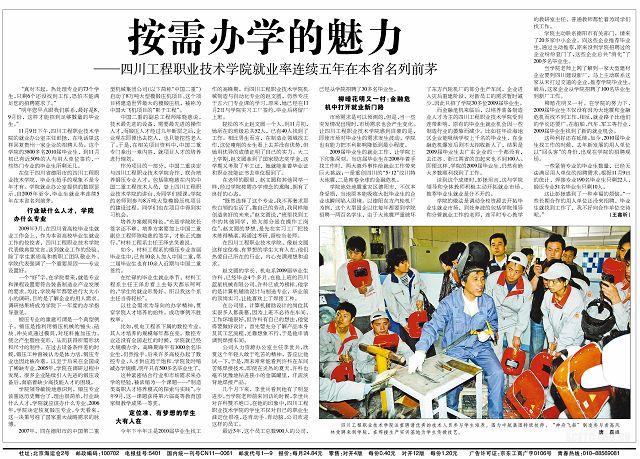 . 在2009年11月24日的《中国青年报》上,一篇名为《按需办学的魅力——四川工程职业技术学院就业率连续五年在本省名列前茅》的文章十分引人瞩目。全文从2010届毕业生走俏的现象入手,分“行业缺什么人才,学院办什么专业”、“定位准,有梦想的学生大有人在”、“金融危机中打开就业新门路”三个部分,图文并茂,层层剖析,深入地报道了我院在人才培养方面的做法和成绩。 《中国青年报》电子版本文阅读链接;http://zqb.cyol.com/content/2009-11/24/content_2949706.htm . 《中国青年报》记者分别采访了学院就业办、机电系、教务处的负责人和部分企业代表,核实各方数据,掌握一手资料