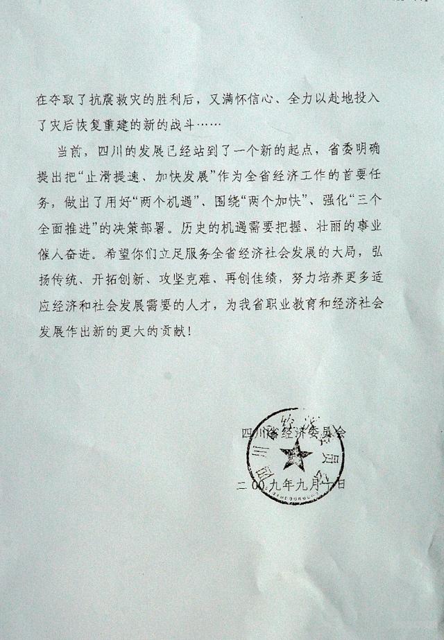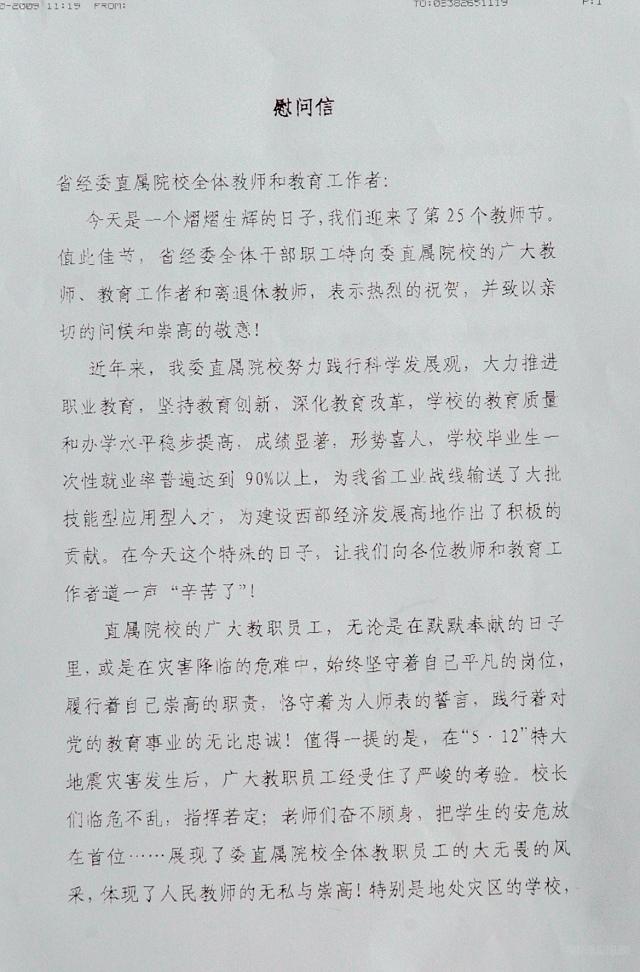 求实创新建功勋,诲人不倦育英才。在第25个教师节来临之际,四川省经委、中国机械教育协会、机械教育发展中心等单位纷纷发来慰问信和贺信,向我院广大教师、教育工作者和离退休教师致以节日的祝贺和诚挚的问候。 省经委在慰问信中指出,历史的机遇需要把握,壮丽的事业催人奋进,希望全体教师立足全省经济社会发展的大局,弘扬传统、开拓创新、攻坚克难、再创佳绩,努力培养更多适应经济和社会发展需要的人才,为我省职业教育和经济社会发展做出新的更大贡献。