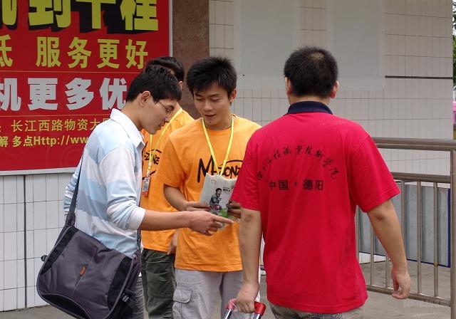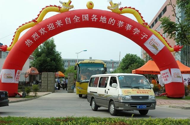 欢迎你,2009级新同学。图为学院新生接待车从北大门徐徐驶出,前往汽车站迎接新生。