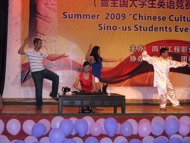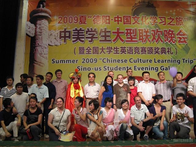 6月14日晚7:30,二教演讲厅灯火辉煌,歌声不断,由外语系主办的2009夏“中国·德阳文化学习之旅”中美学生大型联欢晚会暨09全国大学生英语竞赛颁奖典礼在学院演讲厅隆重举行。密苏里大学Michael Volz先生一行,我院学生处、团委及相关部门负责人、外语系全体师生和美国学生入住的中方家庭成员参加了本次晚会。