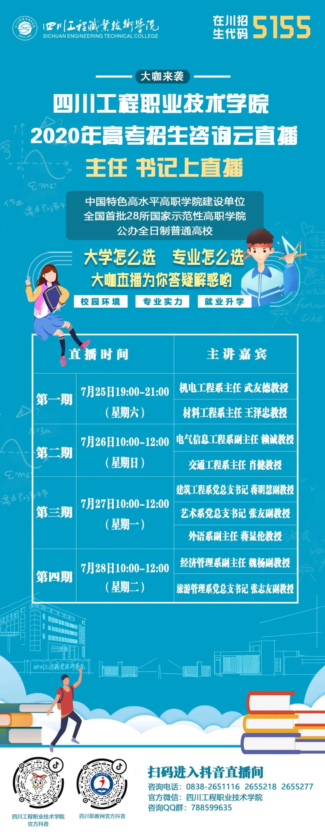 直播公告关于2020高考招生的那些事儿云直播即将开通四川工程职业技术学院喊你来参加!请认准四川工程职业技术学院官方抖音scetcdy1959抖音一下,立即加入!四川职教网抖音平台也同步播出亲爱的考生、家长们,后期还会有不同平台不同场次的高考招生网络直播咨询会,具体播出时间请持续关注四川工程职业技术学院微信公众号、抖音、微博等官方平台,请同学们、家长们届时收看,并直接向老师提问。我们线上相约,不见不散!编辑:党委宣传部审核:党委宣传部、招就办 四川工程职业技术学院微信:scetc-1959抖音:scetcdy1959欢迎投稿,投稿邮箱:wuxlgq@126.com投稿qq:604068023做有温度、有深情的官微 长按二维码关注分享、在看与点赞,至少我要拥有一个吧