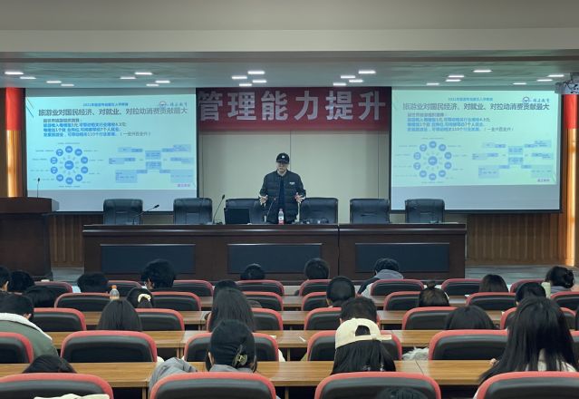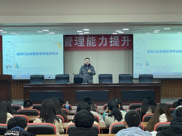 首先,旅游管理系张伟主任向同学们说明此次讲座的目的及意义,有利于同学们对旅游专业进一步深化认识。随后,李老师从“后疫情时代旅游业新职业要求”、“导游成就丰满人生”、“2022年导游资格证考试说明”三个方面向大家分析了当前旅游业的现状和发展前景,为同学们指明就业方向,同时详细介绍了导游考证的相关情况,鼓励同学们争做旅游管理优秀从业者。