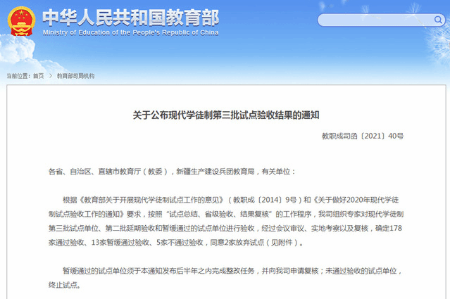 近日,教育部职业教育与成人教育司公布《关于公布现代学徒制第三批试点验收结果的通知》(教职成司函〔2021〕40号),我校作为教育部第三批现代学徒制试点院校,经过上级部门会议审议、实地考察以及复核,顺利通过验收。