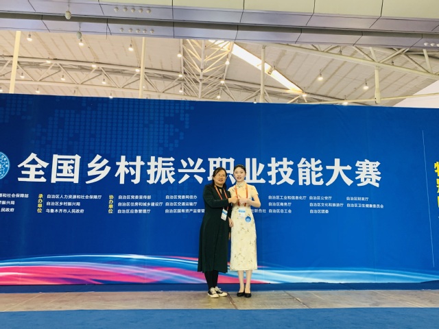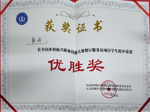 9月10日至9月23日经过短暂的集训,彭语同学与其他27个省份和新疆生产建设兵团的共29名省赛金牌选手进行角逐,选手分别完成主题设计方案及设计说明与答辩和主题造型、主题宴会摆台、服务技能、分餐服务及仪容仪表共四个模块的比拼。彭语最终不负众望在赛场冷静发挥,展现了良好的风采,最终获得全国乡村振兴职业技能大赛优胜奖。