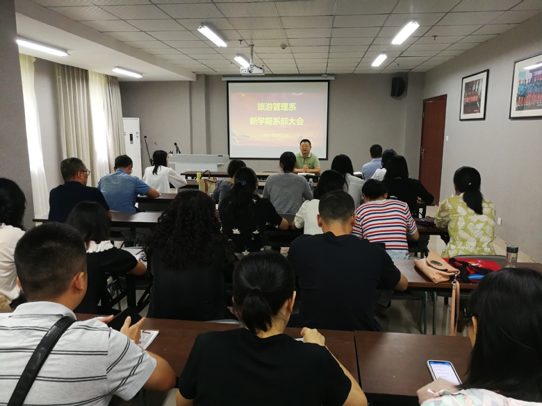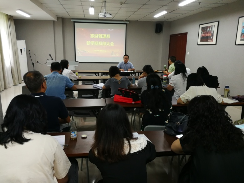 2021年8月27日上午,旅游管理系在旌湖尚品酒店会议室召开了新学期教职工大会,拉开了2021-2022学年新学期工作的序幕。