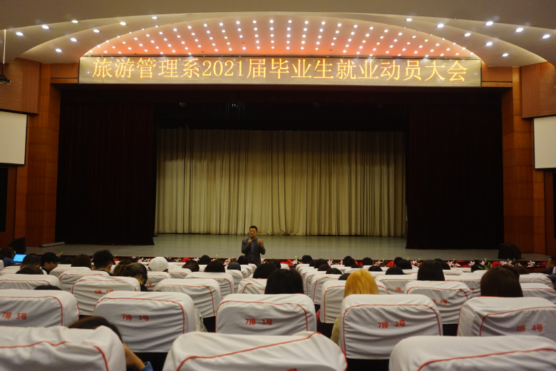 为精细化推进毕业生就业指导和服务工作,2020年10月9日下午,旅游管理系在二教演播厅召开2021届毕业生就业动员大会。旅游管理系张伟主任、张志友书记以及全体2021届毕业生参加大会。