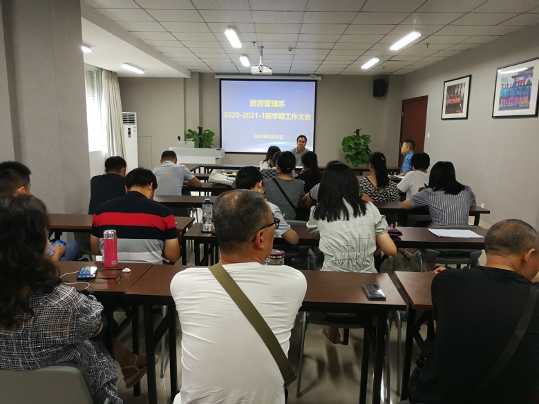 2020年8月28日上午,旅游管理系在旌湖尚品酒店会议室召开了新学期教职工大会,拉开了2020-2021学年工作的序幕。
