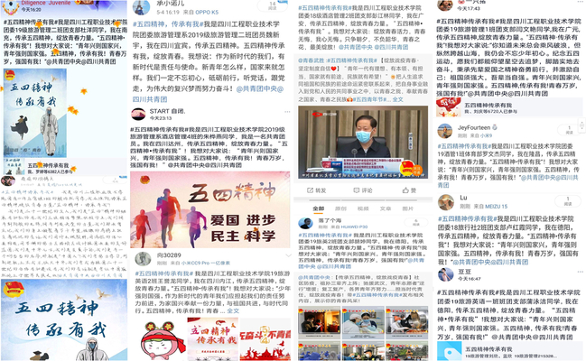 为践行“党有号召、团有行动”的优良传统,积极响应共青团中央发起的#五四精神传承有我#网络主题传播活动,旅游管理系积极开展“五四精神,传承有我”网上主题接力活动,各班级团支部积极响应,同学们通过微博、微信、QQ空间等平台,把想对祖国和广大青年说的话发表出来,展现出我系学子的良好精神风貌,在网上形成了传承五四精神、共话青春责任的热潮。