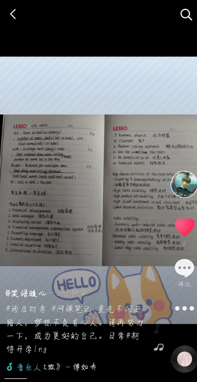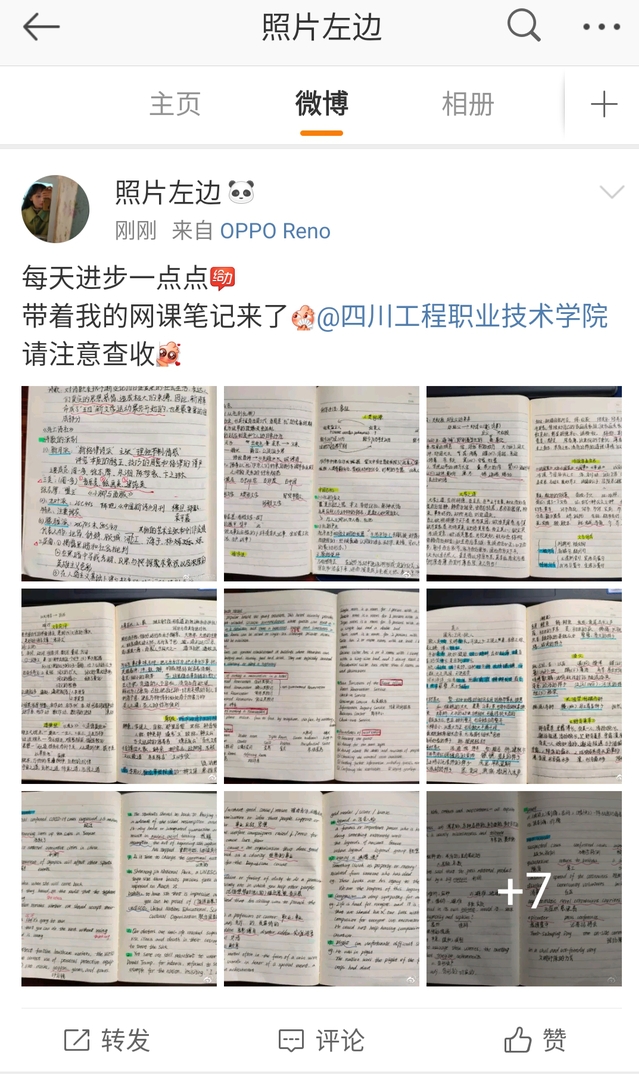 同学们积极参加活动,共征集到156份参赛作品,涉及30余门课程,包括:政策与法律法规、中国旅游地理、客源国概况、综合英语、酒店英语、市场营销学、景观设计概论、高等数学、大学语文、古典爱情诗赏析等。通过抖音、微博、微信等平台进行了笔记作品的线上展示和宣传,同学们的作品在网上评论转发共计超过2000余次,充分展现了学生们的网课学习成果。