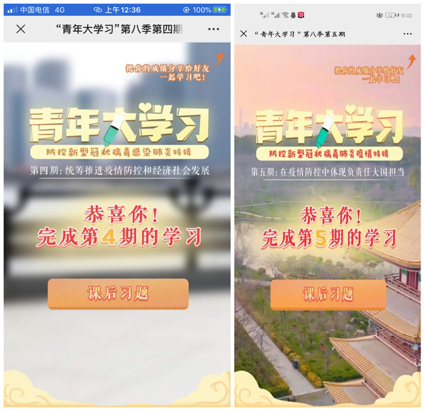 活动开展以来,各班团支部积极组织团员青年进行每周“青年大学习”团课学习,青年大学习每期视频短小精练、学习方便,各班依托微信、QQ群等平台在完成学习后简要交流自己的看法、感悟。本次“青年大学习”网上主题团课主要以疫情防控为主,通过网上团课教学,让广大团员青年正确认识新型冠状病毒,做好及时防护,引导青年在疫情防控中发挥作用。同时各班也要求学习完成后在群里分享截图,积极引导和督促各位青年干部和青年团员积极参与学习,这种创新的网课教学也迎合当前疫情防控下“停课不停学”的方针。同学们表示,团课的学习也进一步坚定了大家打赢这场疫情防控阻击战的信心和决心。