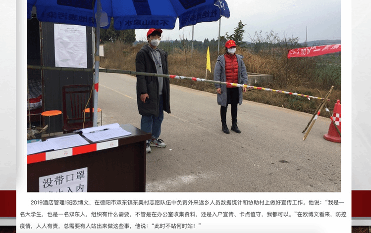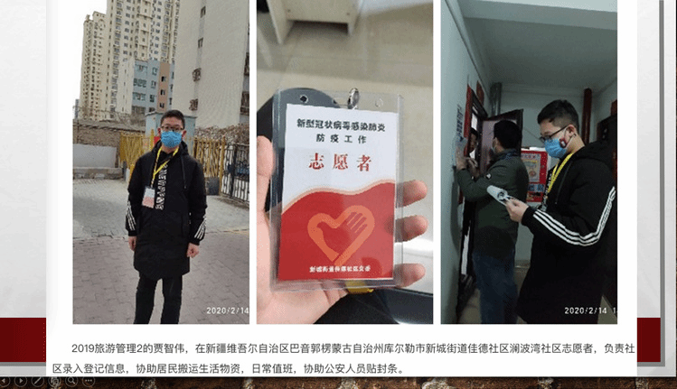 在这次抗击疫情的斗争中,以“90后”为代表的青年一代挺身而出、担当奉献,充分展现了新时代中国青年的精神风貌。习近平总书记给北京大学援鄂医疗队全体“90后”党员的回信中强调了新时代的中国青年是好样的,是堪当大任的!我们深刻的感受到了国家对于广大青年的肯定和期许。“95后”、“00后”抗疫,我们在行动!旅游系系青年有担当,抗疫前线有力量。举国战“疫”之时,旅游系广大青年学生也镌刻下属于他们的时代印记。截至4月13日统计数据,旅游系共有30余名青年学生参与到学校、社区和当地村镇的防疫志愿工作中。这个超长寒假期间,旅游系共有60余名学生坚守坚持在两会驻地酒店、合作企业,用自己的力量为疫情防控、企业复工复产做出贡献,同时也给在我系广大青年学生起到了很好的模范作用。通过视频学习、主题班会宣讲,向广大青年学生讲清了我国的制度优势、大国力量和担当形象,同学们对党中央带领全国人民打赢这场疫情防控阻击战充满了信心,对胜利返校、平安归来充满信心。纷纷表示将持续做好个人安全防护和防疫志愿工作,认真完成线上教学和岗位实践各项任务。