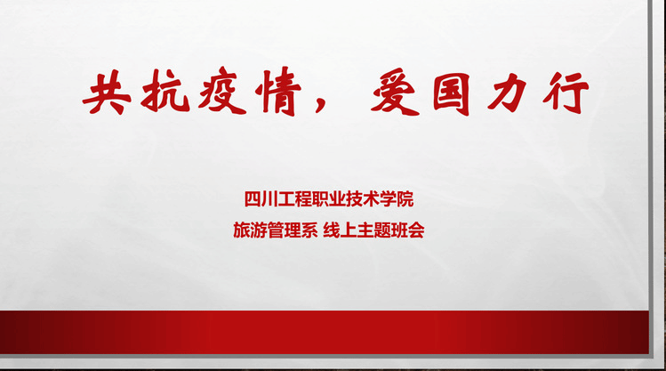 当前,教育系统广大干部师生正在深入学习贯彻习近平总书记重要指示精神,坚决贯彻党中央关于新冠肺炎疫情防控各项决策部署,众志成城、全力以赴,展现出担当作为、共克时艰的良好风貌。为进一步激发广大青年学生的责任担当,坚决打赢疫情防控的人民战争、总体战、阻击战,深入推进爱国主义教育, 2020年4月12日,旅游管理系在全系范围内开展了以“共抗疫情,爱国力行”为主题的线上主题班会。