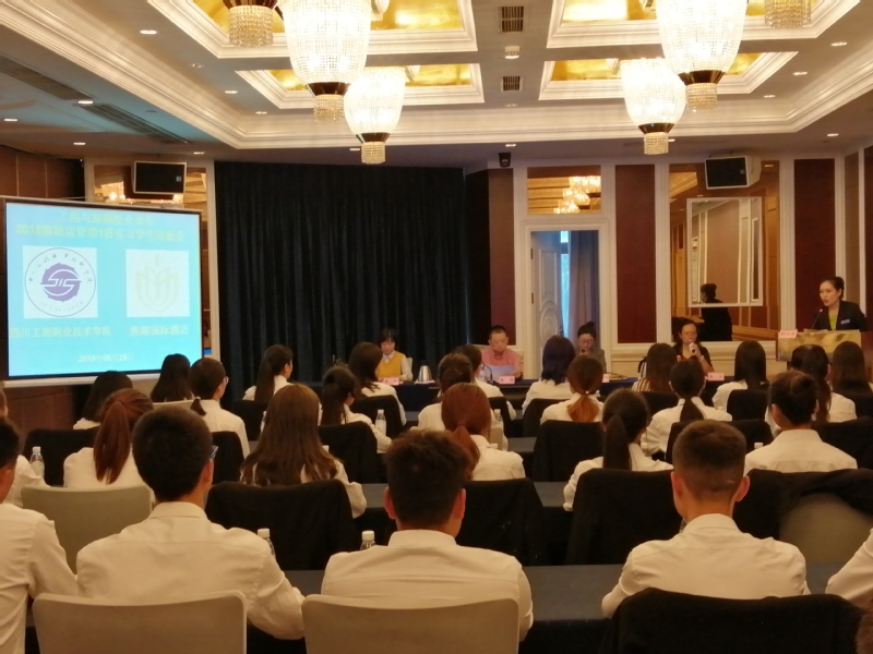 2019年9月5日,旅游管理系2018级酒店管理一班36名同学在德阳旌湖宾馆开始了为期三个月的校外实习,旌湖宾馆为迎接“新员工”,在宾馆1号楼二楼晨曦会议室召开迎新会,德阳旌湖宾馆人事质检培训部经理何慧清女士,旅游管理系主任张伟教授携旅游管理系专任教师朱文及李晖老师出席会议,迎新会在人事质检培训部刘兴莉老师的主持下顺利开展。