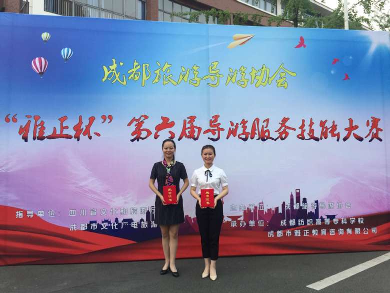 2019年5月25日,由成都旅游导游协会主办、成都纺织高等专科学校承办的“雅正杯”第六届导游服务技能大赛在成都举行。旅游管理系2017级旅游管理专业学生文佳和2018级旅游管理专业学生蒋婉睿代表我院参加了此次比赛。经过激烈的角逐,两位选手均荣获一等奖,我校以团体总分第一荣获团体一等奖。