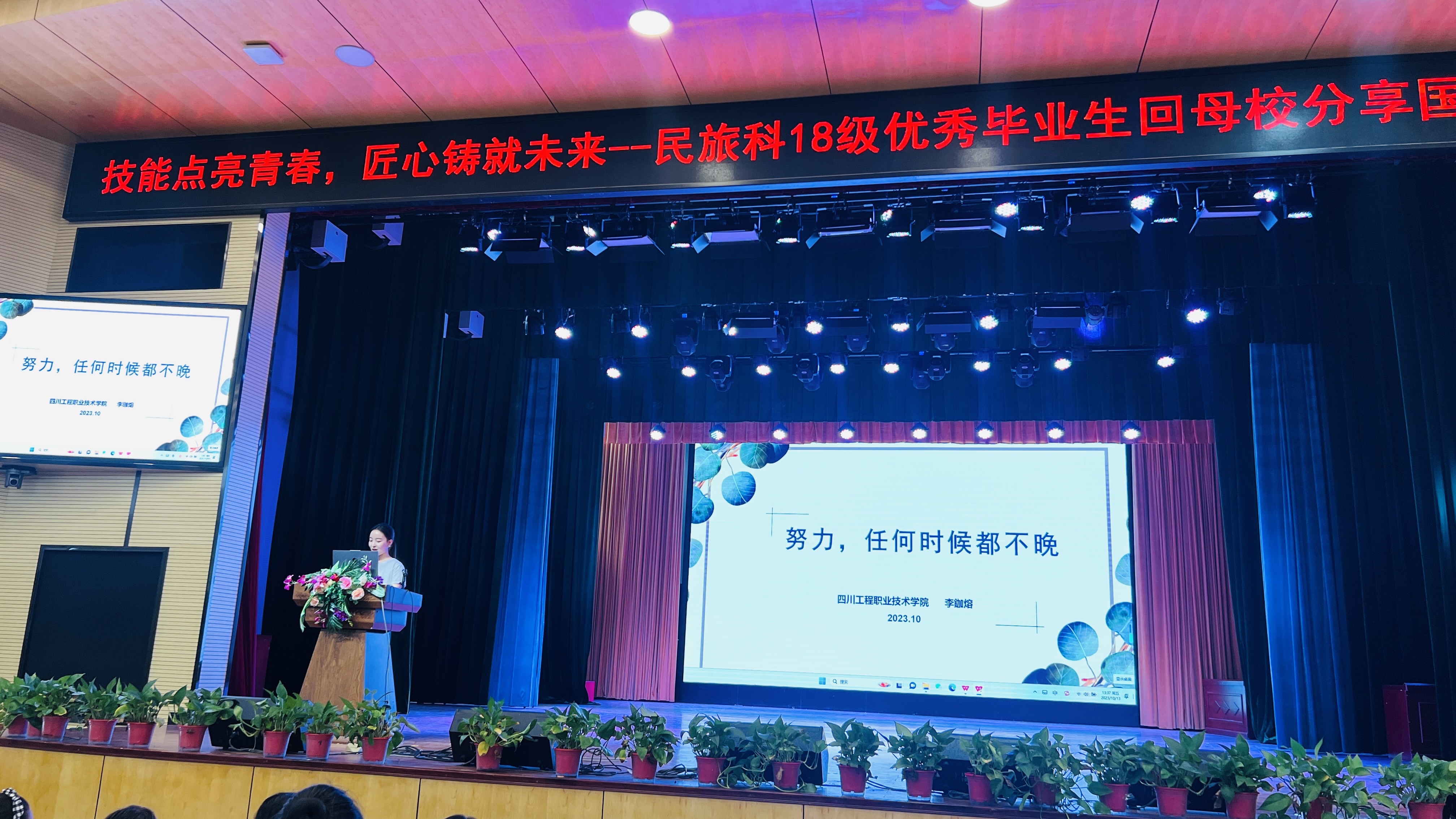 李鉫熔以“努力,任何时候都不晚”为主题,分享了她从中职生逐步成长为全国职业院校技能大赛高职组“导游服务赛项”一等奖获得者的独特经历,详细讲述了在中职、高职阶段如何逆境反击、重塑自我,以及如何通过备赛磨砺精进,完善自我,为日后的职业发展打下坚实的基础。她用自己的亲身经历,展示了以梦为马、志存远方的精神,并告诉绵职学子:只要我们心怀梦想,不畏艰难,就一定能够实现我们的目标。