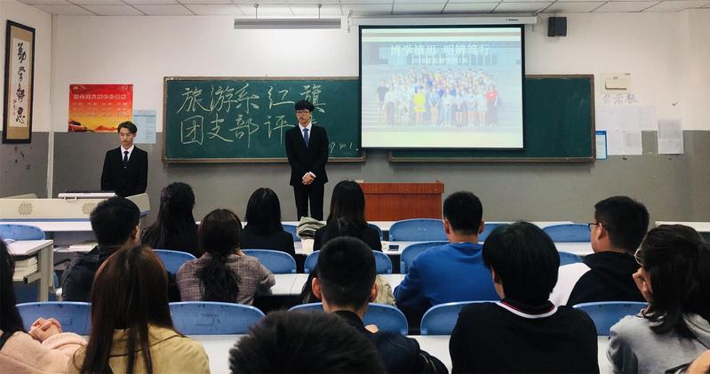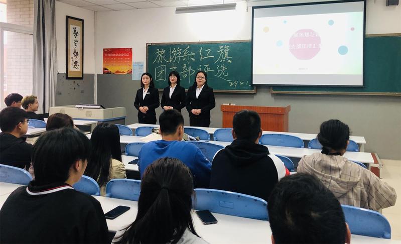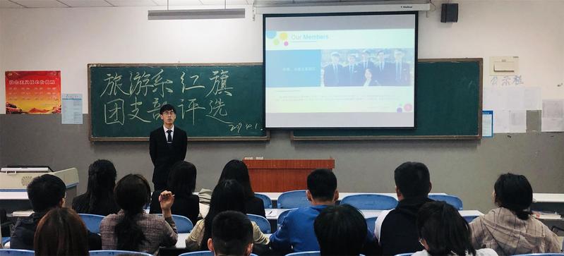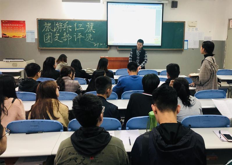 为总结经验、树立典型,调动广大团员青年的积极性,进一步发挥共青团组织在服务青年、服务学院、服务社会中的作用,旅游管理系团总支认真组织开展2018/2019学年团内评优工作,于4月1日16:30在6A501教室举行红旗团支部竞演评选活动,旅游管理系大一、大二各班班团委参与此次活动。