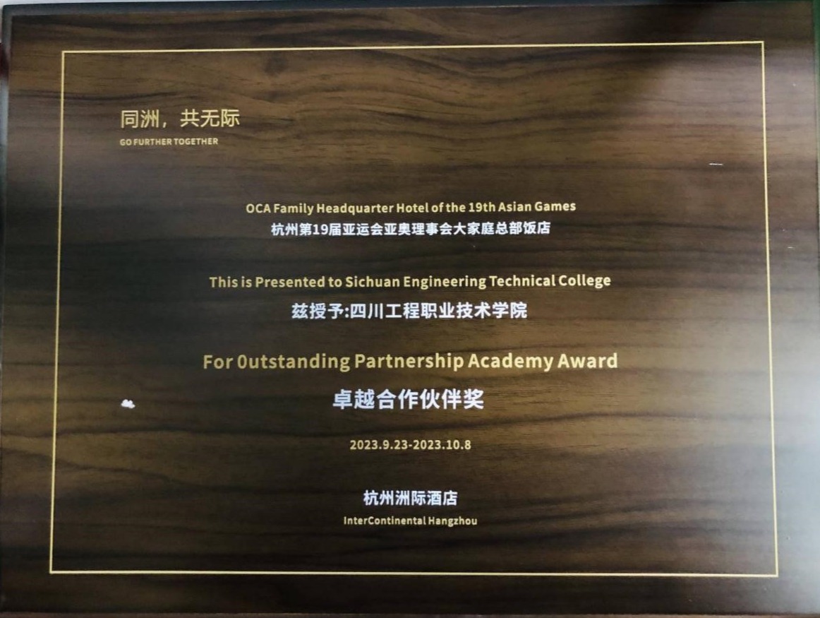 近日,学院收到杭州第19届亚运会OCA(亚奥理事会)大家庭总部饭店——杭州洲际酒店发来的“卓越合作伙伴奖”匾牌。这是对我院旅游管理系6名同学们圆满完成亚运会接待服务工作的充分肯定,也是对学院给予酒店大力支持的诚挚谢意。