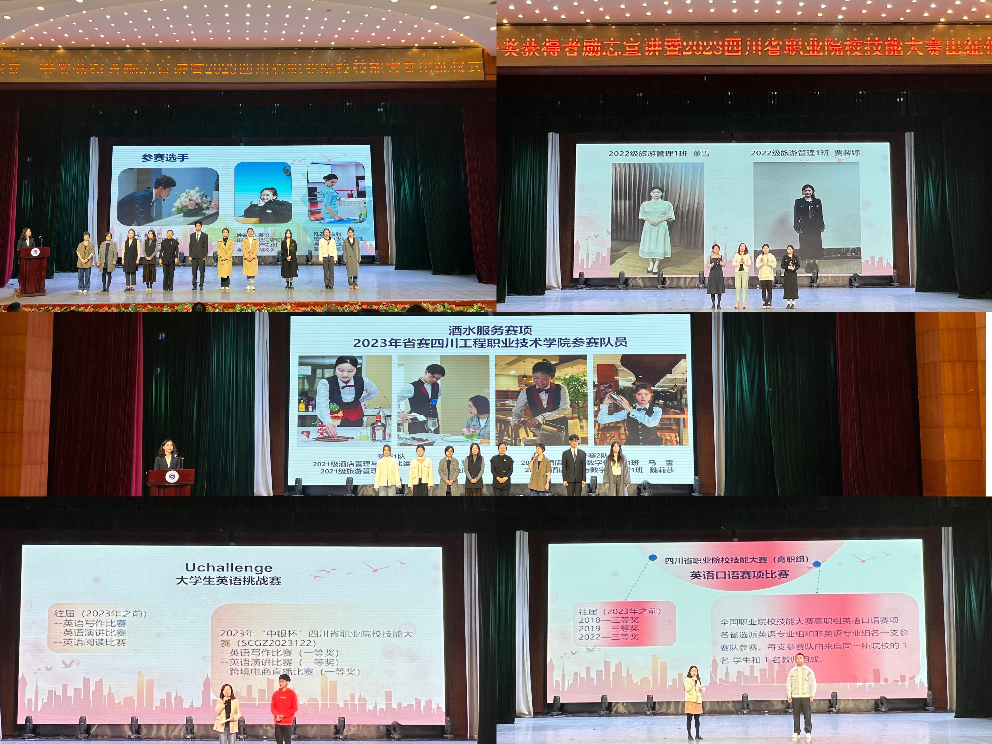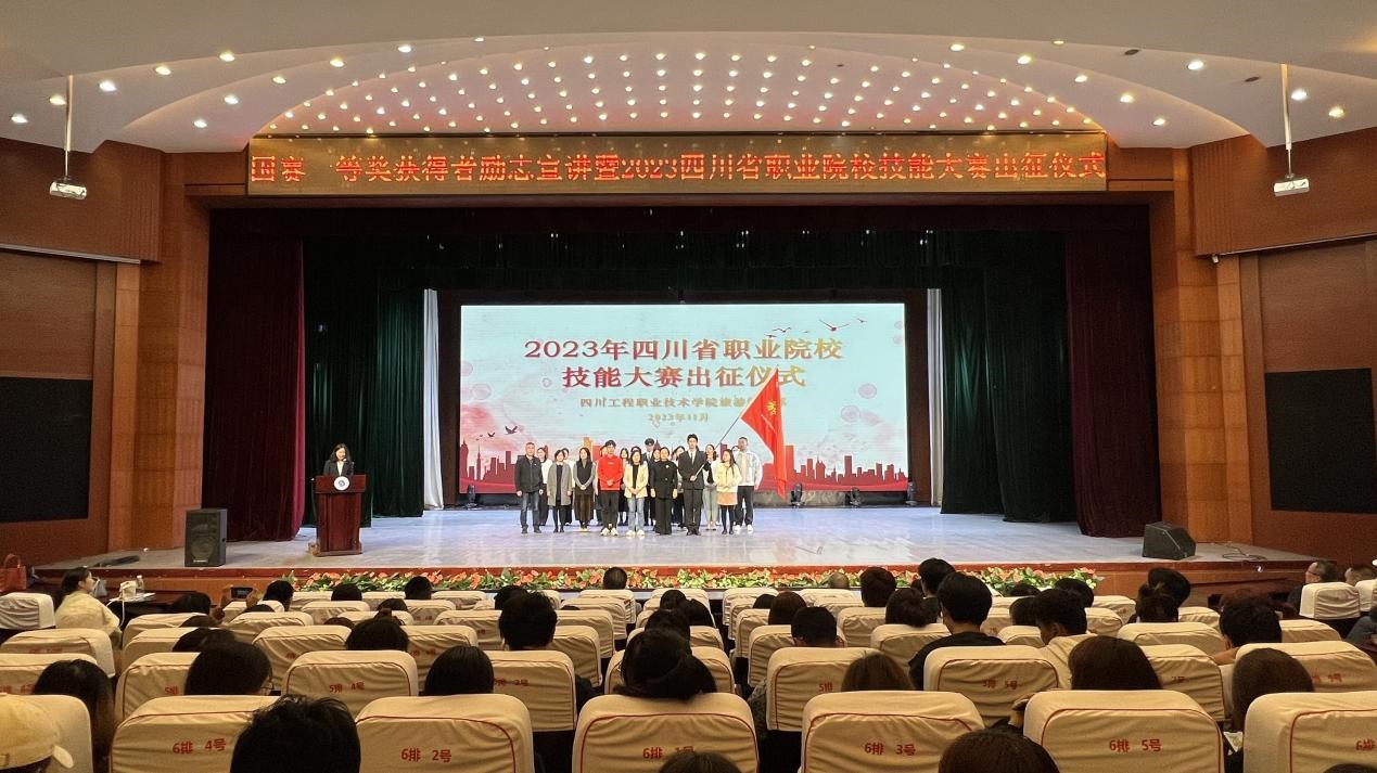 扬理想之帆、为梦想起航,旅游管理系国赛一等奖获得者励志宣讲暨2023四川省职业院校技能大赛出征仪式于2023年11月7日在二教演播厅举行。