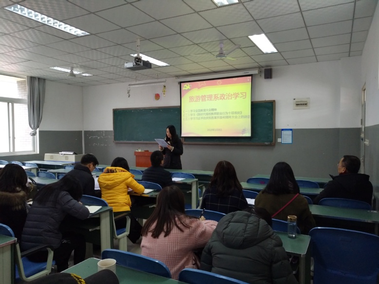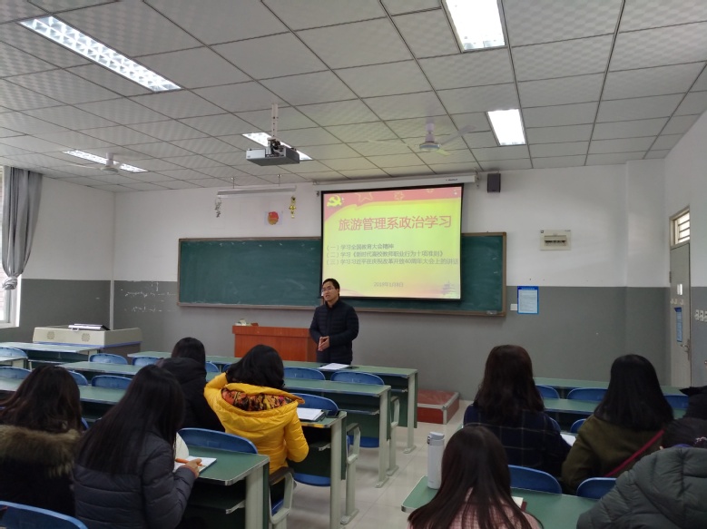 日前,教育部印发了《新时代高校教师职业行为十项准则》。根据学校党委要求,旅游管理系通过召开座谈会形式,于2019年1月8日,在6A502教室,组织全体旅游管理系教师深入学习了《十项准则》,全面理解、准确把握了精神实质。