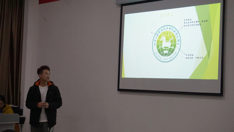 大赛开始后,17位同学依次上台对其团队设计的作品从作品的原创性、主题立意、色彩、思想性四个方面进行了解说,解说过程中,同学们旁征博引、侃侃而谈,一些同学新奇的思想和其作品体现的深刻文化内涵赢得了评委和观众的一致赞赏。其中,一号作品《旅意》,运用中国传统的阴阳文化思想将“旅”字拆解成一个奔跑的男生和一个舞蹈的女生,并用一个简短的微视频讲述了其团队的设计过程,给评委和观众留下了深刻印象;3号作品《山水之旅》想法新奇,将水墨山水组合整体设计成一个看似眼睛的形状,寓意“旅途中不是缺少美,而是缺少发现美的眼睛”……