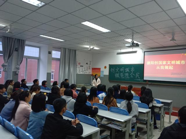 2018年2月,德阳正式被中央文明办确定为2018~2020年创建周期“全国文明城市提名城市”,开启德阳“创文”新征程。为响应号召,积极投身创文活动,根据学院党委宣传部、学生处工作要求,2018年11月11日晚,我系各班级在班级导师、辅导员(班主任)的组织下,认真开展“创国家文明城市,做文明市民”主题班会。