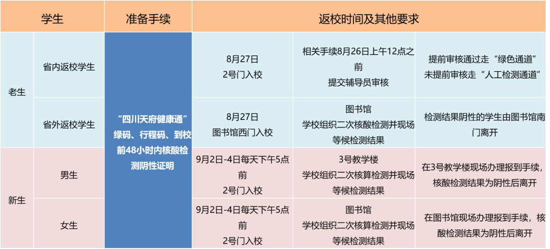 根据四川省教育厅、四川省卫生健康委员会《四川省学校2021年秋季学期开学新冠肺炎疫情防控工作方案》,经学校研究,现对开学安排及返校要求通知如下,请逐条对照细读!