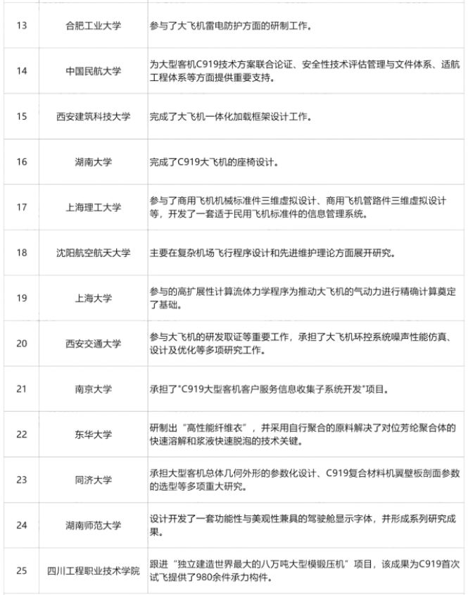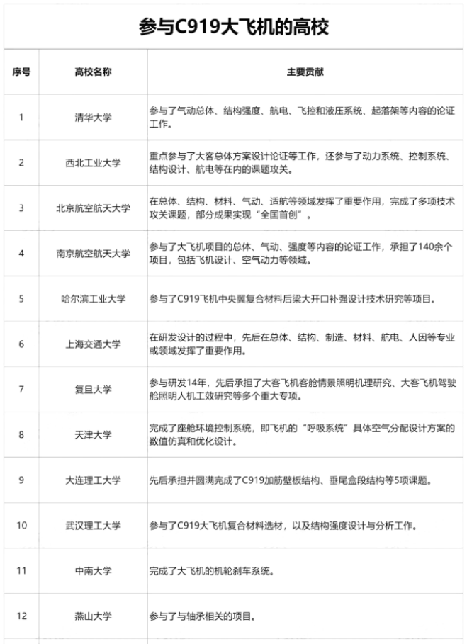 回顾C919大飞机的研制,它聚集了我国数十万科研人员的心血。其中,清华大学、北京航空航天大学、西北工业大学、南京航空航天大学、上海交通大学、哈尔滨工业大学等多所高校先后参与了C919大型客机的研制,做出了卓越贡献。对此,小编进行了相关资料的收集,统计如下表所示: