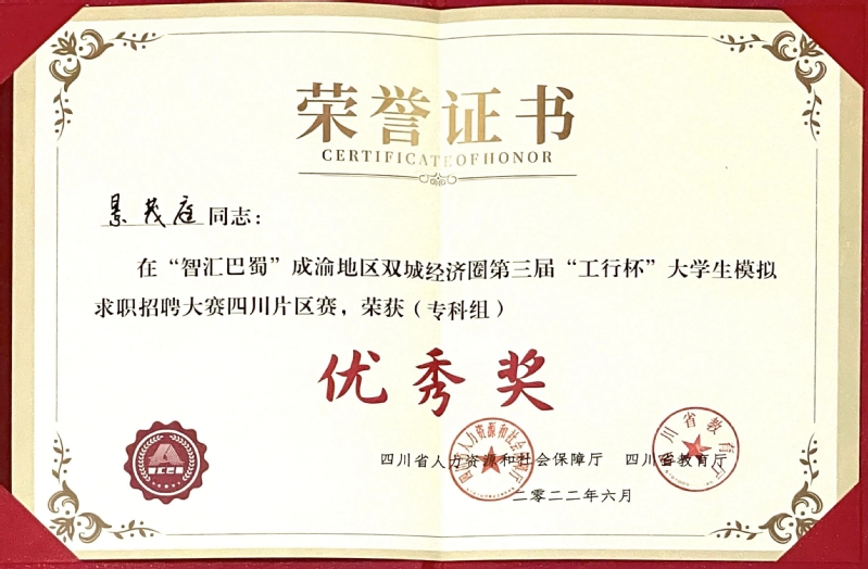 6月10日,“智汇巴蜀”成渝地区双城经济圈第三届“工行杯”大学生模拟求职招聘大赛四川片区赛落下帷幕,我校材料工程系2020级焊接技术与自动化专业学生景茂庭同学获优秀奖。
