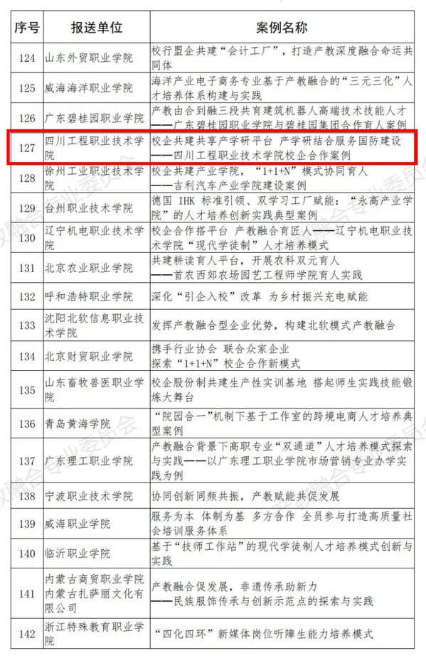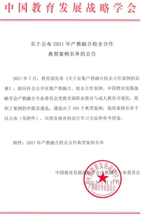 2021年7月,教育部发布《关于征集产教融合校企合作案例的启事》,面向社会公开征集产教融合、校企合作案例。中国教育发展战略学会产教融合专业委员会受教育部职业教育与成人教育司委托,组织了案例的申报及遴选,最终遴选出了485个典型案例。由材料工程系报送的“校企共建共享产学研平台,产学研结合服务国防建设”入选。