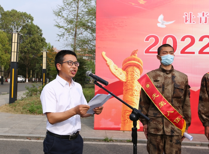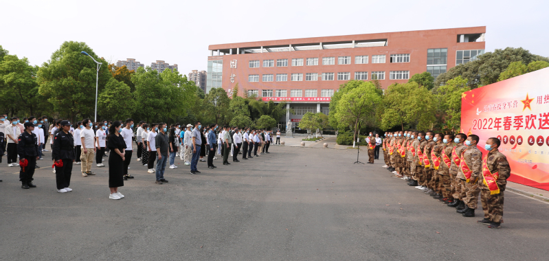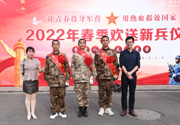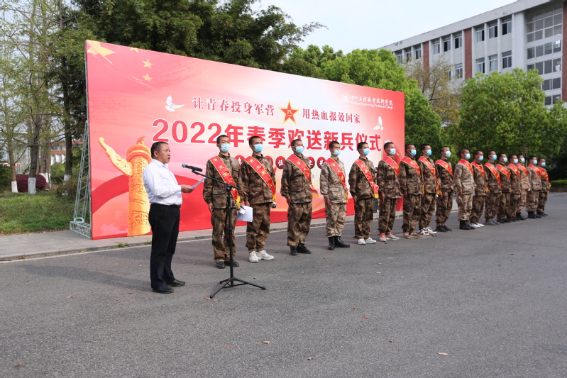 离校踏征程,激情似雄鹰。披上绿色的军装,戴上鲜艳的大红花,扬帆起航,去诠释热血男儿的深情。2022年3月18日下午,我校2022年春季欢送新兵仪式在图书馆外广场举行。德阳市旌阳区人民武装部部长刘强,校党委书记李登万,党委副书记、院长肖峰,党委副书记、纪委书记郑辅春,党委委员、副院长向桢,以及各系党总支、学校党委武装部、校团委、新兵家属、学生代表等150余人出席仪式,与即将入伍的17名新兵齐聚一堂。欢送仪式由学校党委武装部部长侯勇主持。