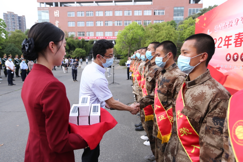 仪式上,学校党委书记李登万为新兵送上寄语:部队是一座大熔炉,它不仅能磨炼人的意志,还能引导大家树立正确的价值观、人生观和世界观。希望新兵们能够快速适应部队生活和训练,不怕吃苦、不怕困难,从一点一滴做起,在不断的学习中成长起来,争取早日立功,为家乡报喜、为母校添彩。学校党委副书记、院长肖峰亲自为每名新兵送上了纪念品。由学校党委委员、副院长向桢宣读了《关于滕永健等17名青年审批入伍的通知》文件。