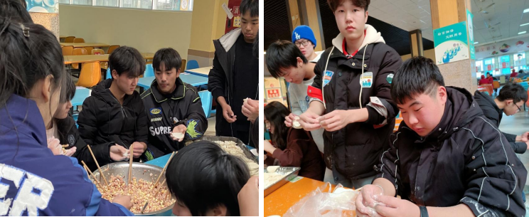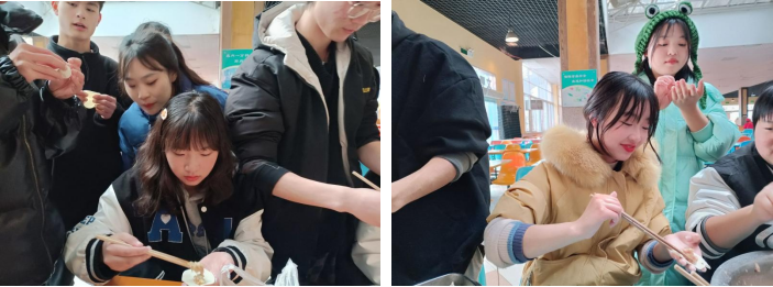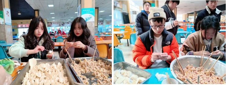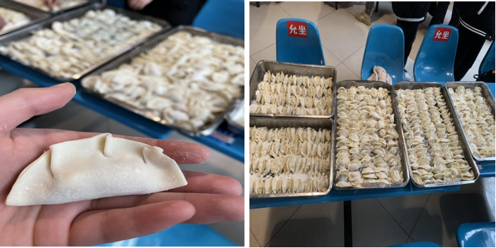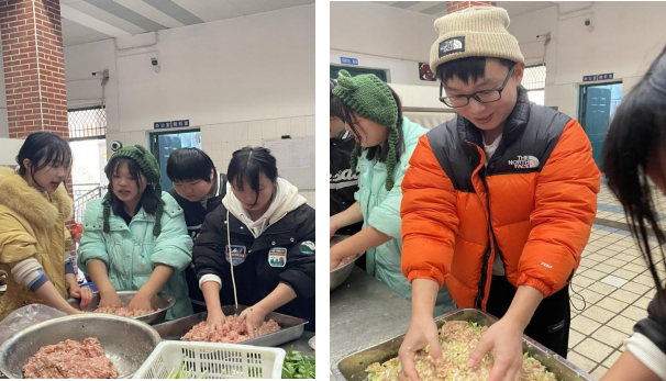 开始包饺子,同学们兴奋地冲到桌子旁,捋起衣袖,跃跃欲试,一个个奇形怪状的饺子躺在了托盘上,有圆的,有长的,有尖的,有扁的,千奇百怪,可爱调皮。不会包同学的向会的学习,渐渐也能熟练地包出来漂亮的饺子。不一会儿一只只精巧的饺子便诞生了,有些同学虽然是第一次包,动作略显笨拙,但经过几次练习便可以包出像模像样的饺子啦。大家有说有笑,分享包饺子的经验,交流学习经验,场面热闹而温馨。