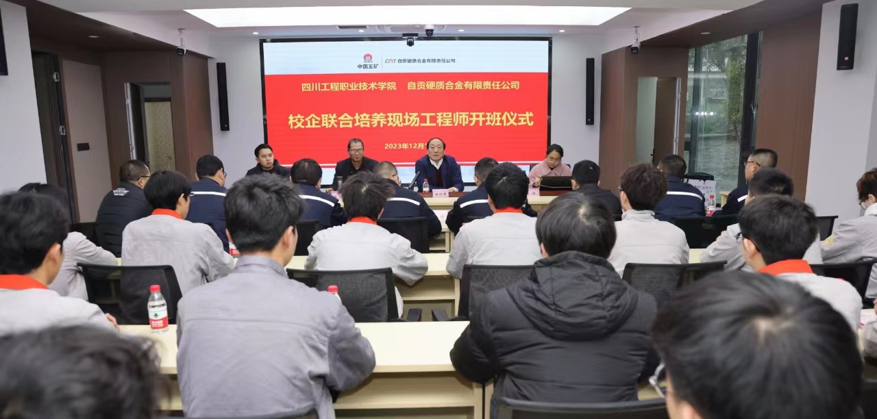 2023年12月11日,材料工程系自贡硬质合金有限责任公司现场工程师班的开班仪式在公司外贸大楼二楼会议室顺利召开,公司董事长、党委书记胡启明对全体师生的到来表示热烈欢迎,对同学们的学习提出了殷切希望,材料工程系就业干事肖方志老师代表学校对同学们在实习期间的安全和纪律提出了要求,仪式由公司人力资源部副部长陈玲主持,材料工程系胡垚老师、公司相关部门代表和现场工程师班21名学生参加了仪式。