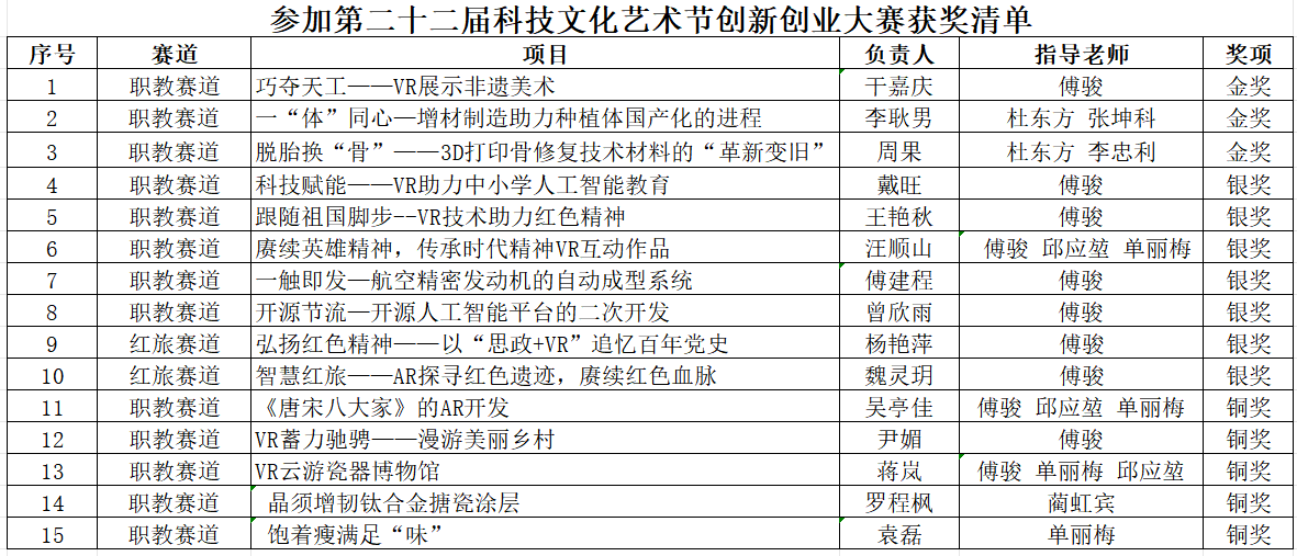 学校第二十二届科技文化艺术节创新创业大赛暨第十届中国国际大学生创新大赛校赛决赛于4月25日、26日在6C203举行。我系由傅骏老师指导的“巧夺天工——VR展示非遗美术”项目,杜东方老师指导的“一“体”同心—增材制造助力种植体国产化的进程”、“脱胎换“骨”——3D打印骨修复技术材料的“革新变旧””等三个项目获得了金奖。据悉,此次大赛分为初赛、复赛、决赛三个阶段,我系提交的项目共获得了3个金奖、7个银奖、5个铜奖的优异成绩。