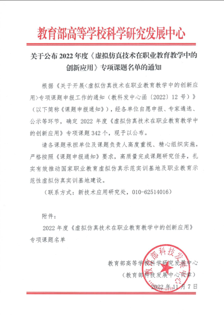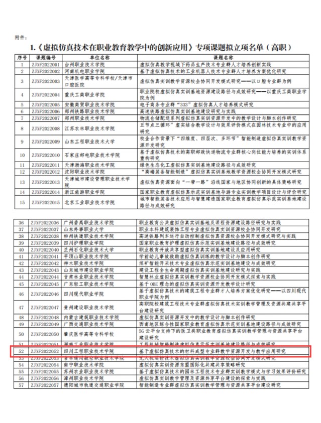 2022年11月7日,教育部高等学校科学研究发展中心公布2022年度《虚拟仿真技术在职业教育教学中的创新应用》专项课题名单。根据《关于开展< 虚拟仿真技术在职业教育教学中的创新应用>专项课题申报工作的通知(教科发中心函〔2022〕12号)》,经申报、各省推荐、专家遴选、公示等环节,确定2022年度《虚拟仿真技术在职业教育教学中的创新应用》专项课题342个,其中四川工程职业技术学院材料工程系申报的《基于虚拟仿真技术的材料成型专业群教学资源开发与教学应用研究》课题成功入选、立项。