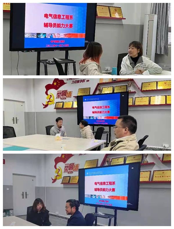 在2022年11月25日下午16:00电气系2022年辅导员素质能力大赛初赛在孵化大楼三楼会议室拉开帷幕。电气信息工程系党总支书记张友、党政办主任黄亮、学工组长胡萍、学工干事黄朝鸣、组织员卿雯出席并担任初赛评委,本次比赛参赛的辅导员有:李晶、邓琳、任沁、胡蕾和王惟恪。