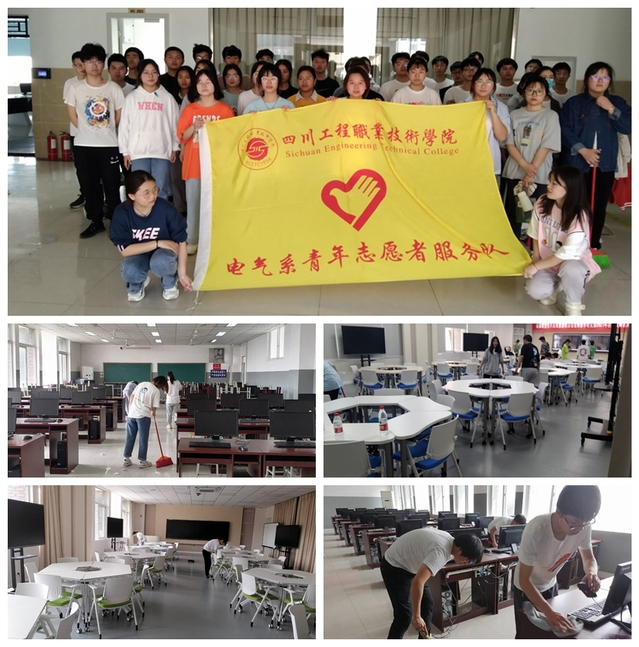 电气信息工程系系青年志愿者于2022年3月17日在德阳市四川工程职业技术学院六号教学楼开展了“美化校园,洁净机房”的志愿者活动。本次活动的主要目的是通过志愿者活动让同学们对我们的校园机房进行爱护与美化。本次打扫的地点是在学校第六教学楼的十一个机房,每个机房由四位志愿者进行打扫。